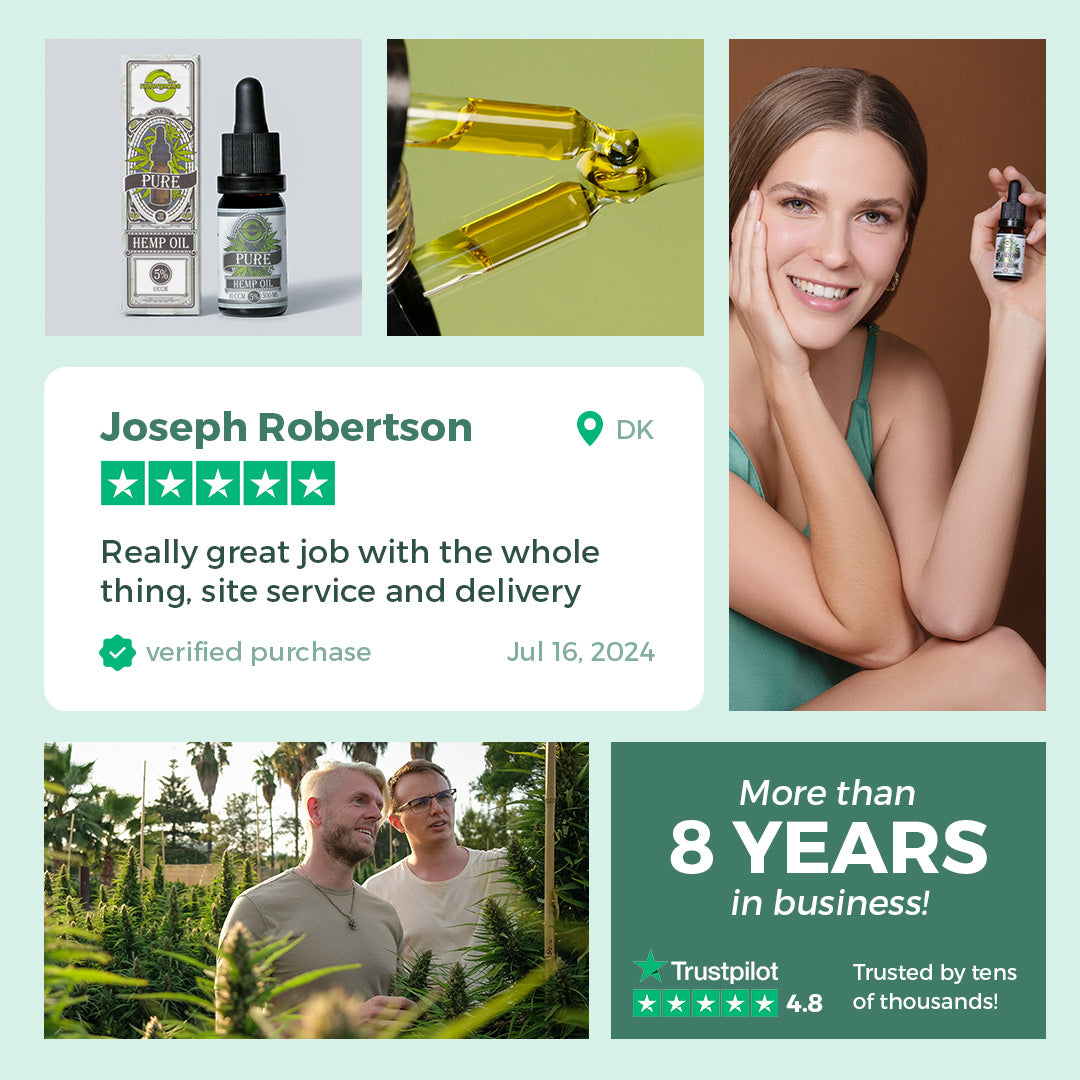 The PURE series without THC. The series comes in concentrations from 5 to 35% and is extracted from organic hemp. The oil has a delicious mild taste. We work with different farmers around Europe to ensure we always get high quality biomass. Our PURE series contains a wide range of cannabinoids and terpenes like the fresh product.